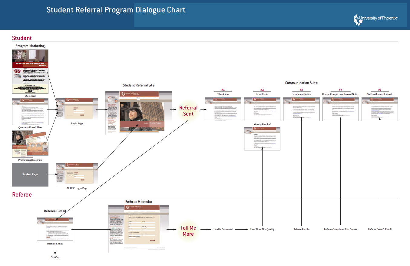I was the communication strategist and lead copywriter on the project. I wrote content for a microsite in which students could become educated about the program, enroll in the program and then submit referrals. Once referrals were submitted, they went into the University of Phoenix database to ensure the lead did not already exist. Once validated, an email confirming the submission was sent back to the student.
