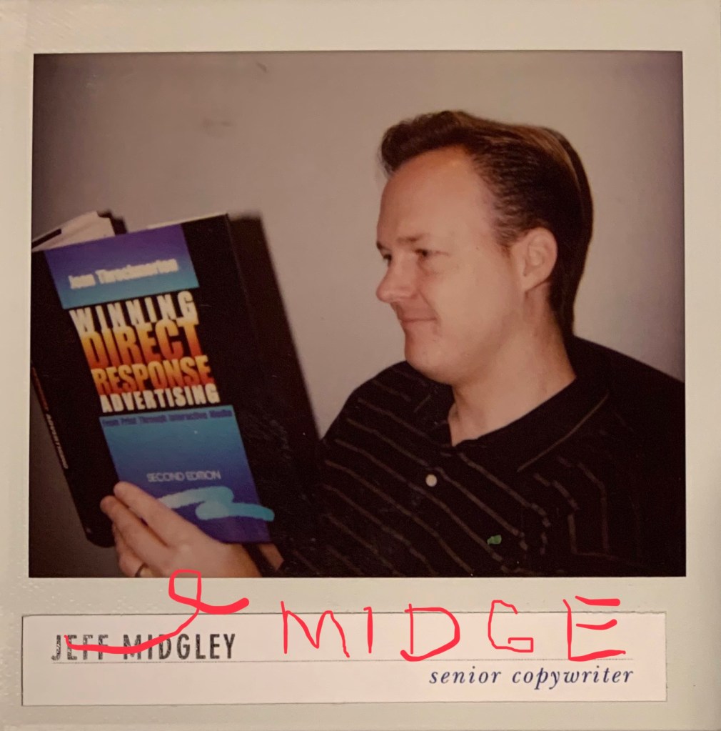 Jeff #3: At the bottom of the totem pole was me, a young and eager copywriter. Since Jeff was now officially reserved for referring to the partner, everyone started calling me by my last name too. At first it was Midgley—but why fumble over two syllables when you can go with one?