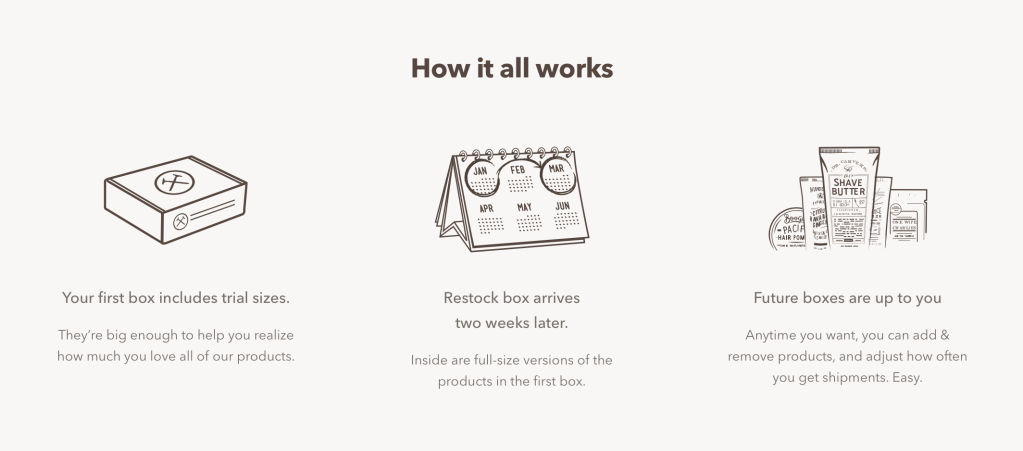 This “how it works” microcopy from Dollar Shave Club not only helps set expectations, but also preps the user to make the next step.